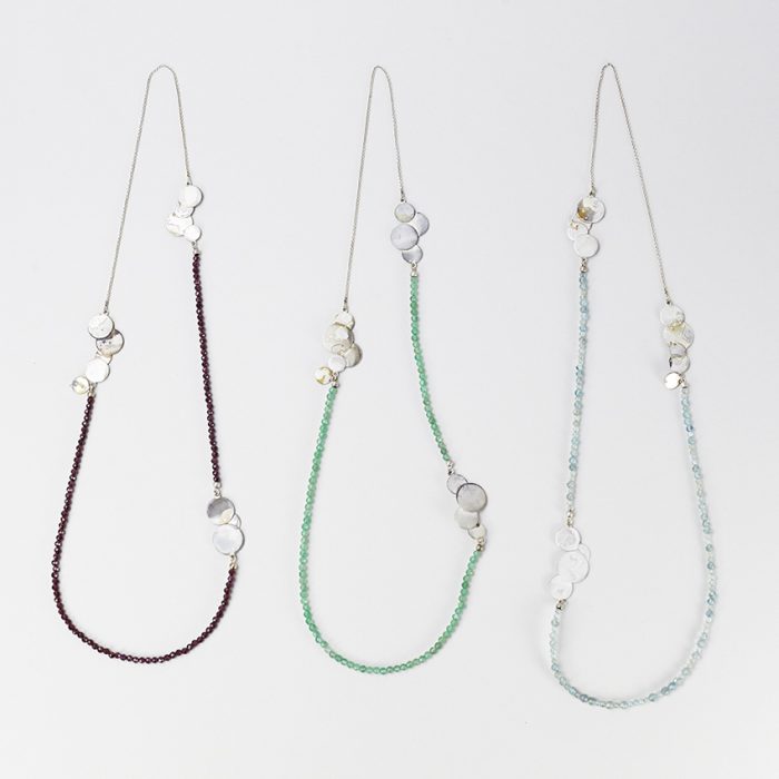 Halsband i silver med olika stenar av Åsa Lockner. Halsbanden träs över huvudet.