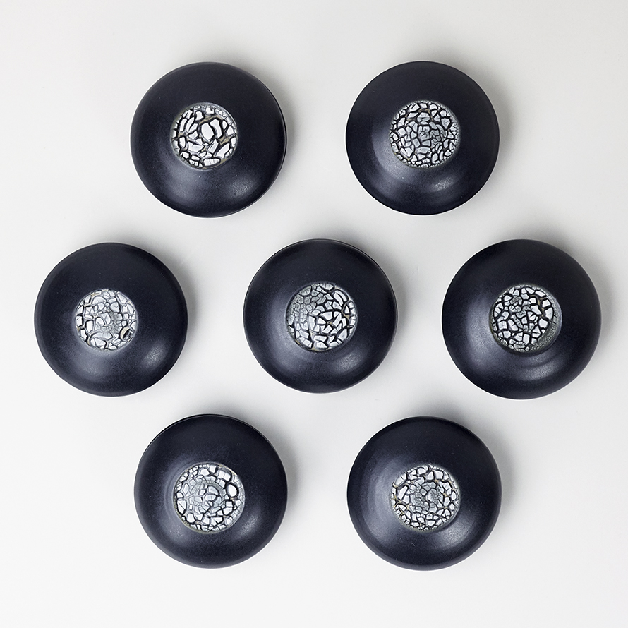 Svarta burkar i svart stengods med krypglasyr av Pia Ulfendahl.