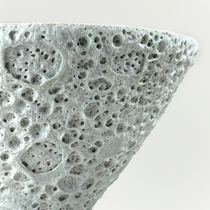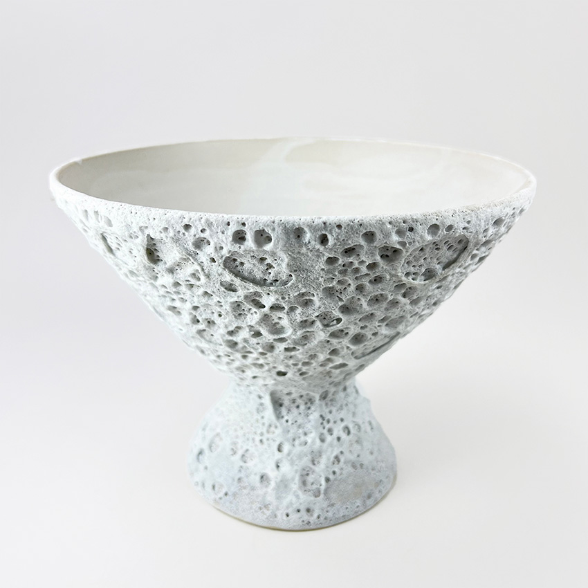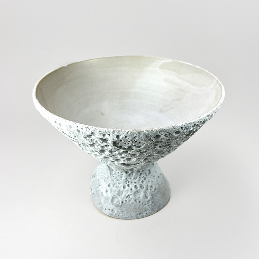 Skål i keramik med ljusblå kraterglasyr av Melanie Baker Hörnstein.