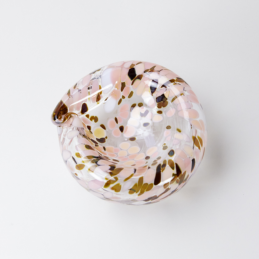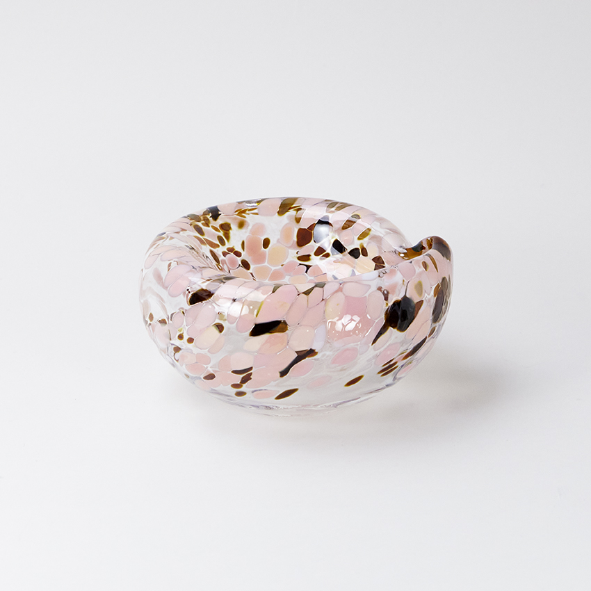 Liten skål med rosa prickar på klarglas: Diameter ca 16 cm, höjd ca 8,5 cm.
